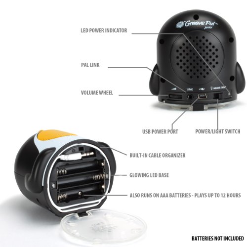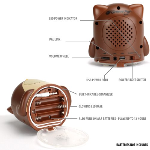Technische Daten: Lautsprecher: 3W; 6W (hochsten) / Audio Input: 3,5 mm Anschluss / Audio Kabellange: 36.8 cm / Power Input: 3x AAA Batterie oder USB DC 5V / Batterie Laufzeit: Bis zu 12 Stunden / Abmessungen: 9,1 x 8,89 x 7,6 cm / Gewicht: 148 g