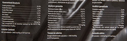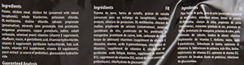 原材料:ジャガイモ、チキンミール、鶏脂肪(保存用に混合トコフェロールを使用)、ブルーベリー、塩化カリウム、DLメチオニン、塩化コリン、プロピオン酸カルシウム、ミネラル類(亜鉛、鉄、マンガン、銅、ヨウ素、炭酸コバルト、セレン酵母)、ビタミン類(ビタミンE、リボフラビン、ナイアシン、D-パントテン酸、チアミン塩酸塩、ビタミンA、ピリドキシン塩酸塩、ビオチン、葉酸、ビタミンB12、ビタミンD3)、タウリン、酵母エキス(プレバイオティクスの原料)、グルコサミン塩酸塩