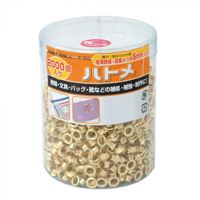 fk094igrjs収納や持ち運びに便利円筒ケースに入った片面ハトメ2000個入りです サイズ 個装サイズ:8×10×8cm 重量 個装重量:259g 素材・材質 極薄鉄板+真鍮メッキ 仕様 厚さ約2.0mmまで対応 製造地 台湾 持ち運びに便利な円筒ケース入り 収納や持ち運びに便利円筒ケースに入った片面ハトメ2000個入りです