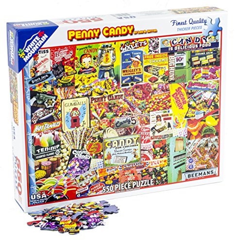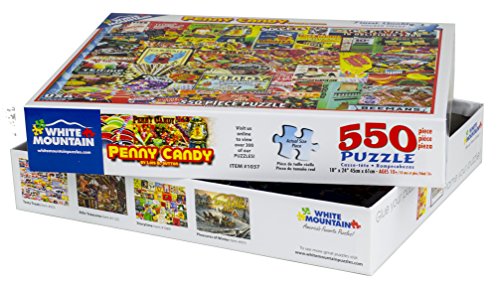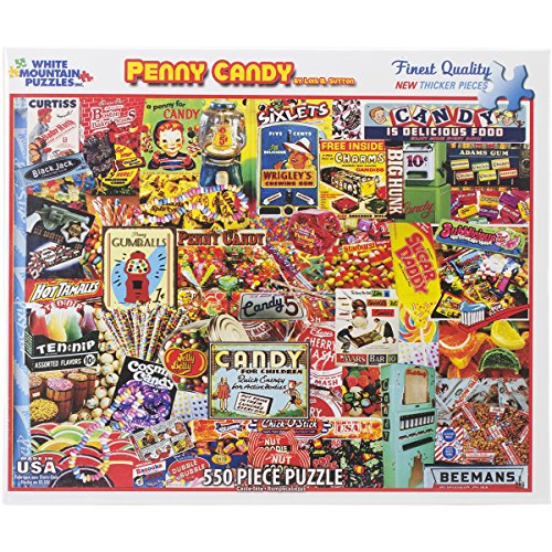 -. Binding : Toy -. Brand : White Mountain Puzzles -. Department : Dessert -. EAN : 0683203592727 -. Feature : PENNY CANDY: Remember the penny candy from the good ole days? Artist Lois Sutton will refresh your memory with this brightly colored picture puzzle. This jigsaw puzzle is a colorful collage of penny candy from years past. / FAMILY TIME: Jigsaw puzzles are a great family activity. Enjoy some quality time, have some fun and take a walk down memory lane while putting together this penny candy puzzle by White Mountain Puzzles. / THE PIECES: This Penny Candy puzzle consists of 550 unique interlocking pieces that are made of sturdy blue chipboard on recycled paper. It has extra large pieces making them easy to pick up. / FINISHED PRODUCT: When you complete this sweet Penny Candy puzzle by White Mountain Puzzles, you will have a colorful 18" x 24" picture puzzle. This will make a tasteful gift for anyone who remembers penny candy. / HAPPINESS GUARANTEE: White Mountain Puzzles are proudly manufactured in America and come with a 100% customer satisfaction guarantee. All of the 550 piece jigsaw puzzles are made of premium blue chipboard. -. IsAdultProduct : 0 -. ItemPartNumber : 1037 -. Label : White Mountain Puzzles, Inc. -. Manufacturer : White Mountain Puzzles, Inc. -. Model : WM1037 -. MPN : 1037 -. PackageQuantity : 1 -. PartNumber : 1037 -. ProductGroup : Toy -. ProductTypeName : TOYS_AND_GAMES -. Publisher : White Mountain Puzzles, Inc. -. Studio : White Mountain Puzzles, Inc. -. Title : White Mountain Puzzles Penny Candy - 550 Piece Jigsaw Puzzle -. UPC : 724819256389 -. Warranty : No Warranty