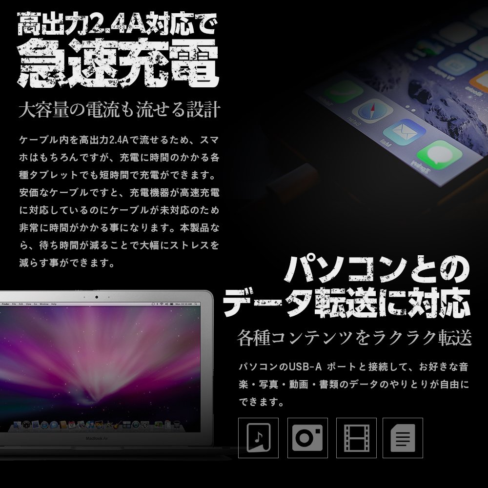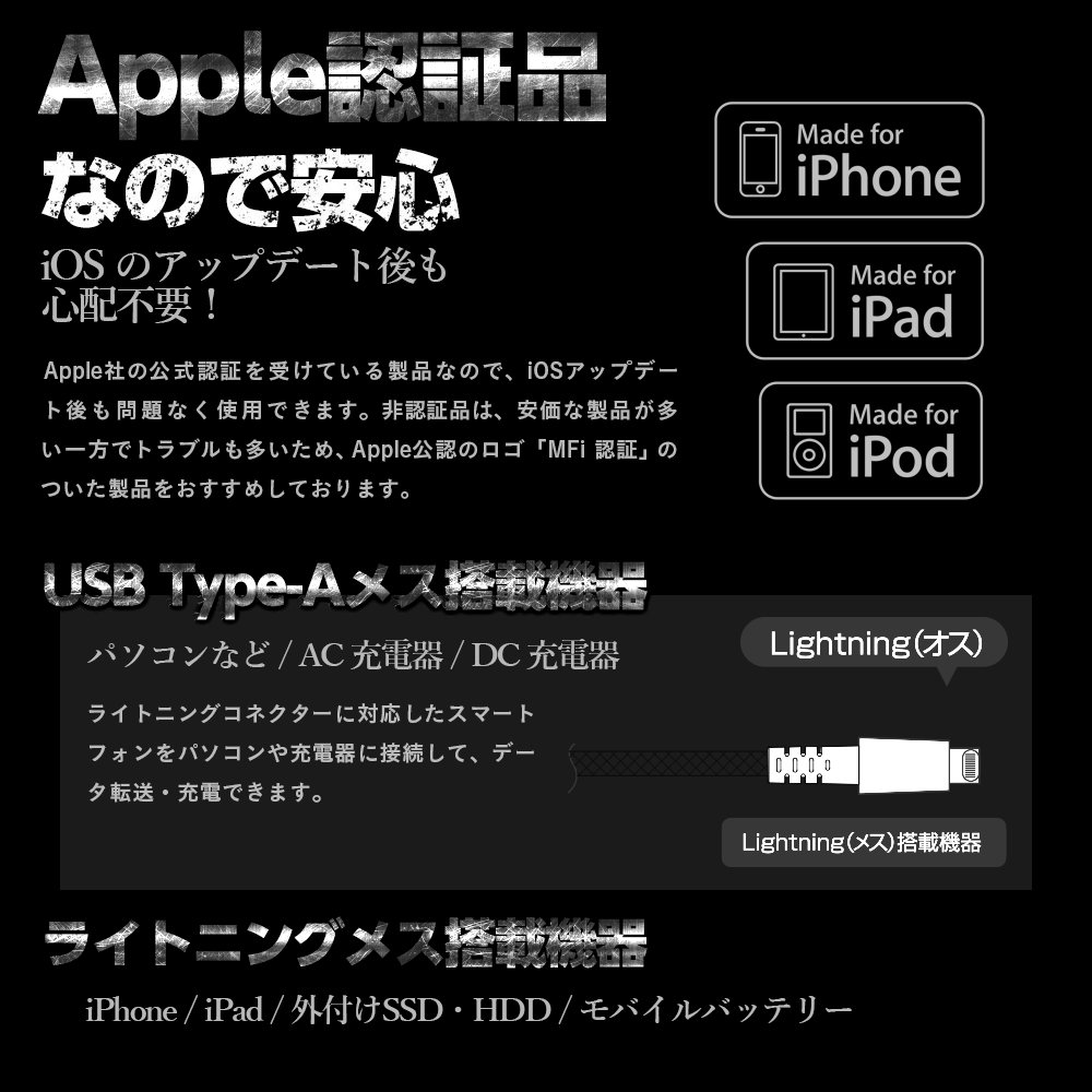 It is a Lightning cable that can be connected to a USB AC adapter or PC, equipment such as iPhone or iPad, and can charge quickly and transfer data.