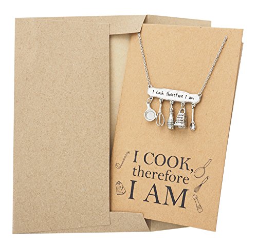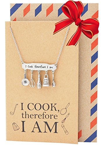 Our Cooking Charm Baking Necklace is perfect for your loved ones who love to cook. This chef jewelry makes a lovely gift for chefs, cooks, mom, dad, grandma, sister, aunts and friends. These gifts for mom come with greeting cards with a quote that reads: "I cook therefore I am"