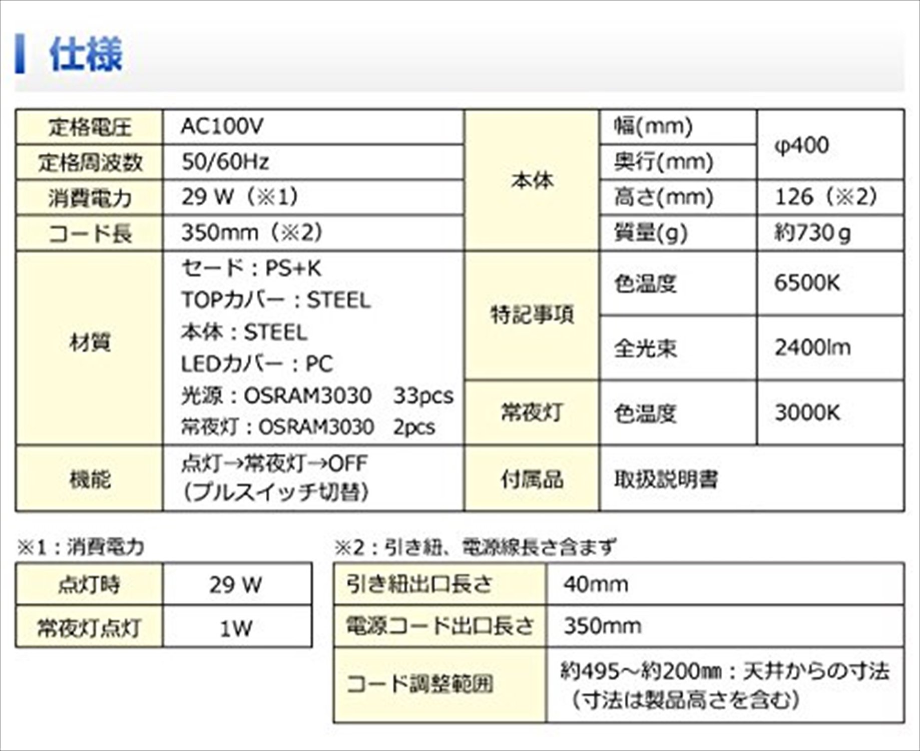 ● Simple function to switch in order of lighting → night light → off when pulling the switch cord