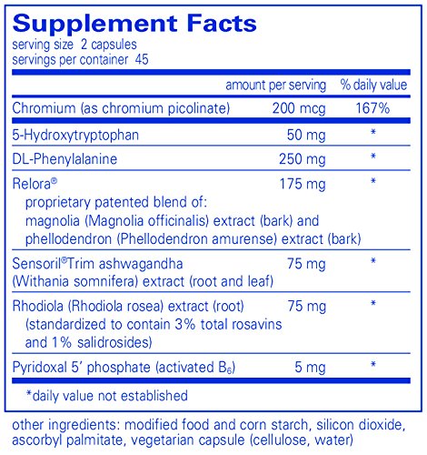 Studio : Pure Encapsulations Publisher : Pure Encapsulations Binding : Health and Beauty Product Description This formula supports healthy neurotransmitter metabolism, affecting the appetite and mood centers of the brain. 5-HTP is a precursor for serotonin, the same neurotransmitter released by the consumption of carbohydrates and associated with enhanced mood. At the same time, dl-phenylalanine supports dopamine and epinephrine production, responsible for the sensation of well-being. Vitamin B6?is integral as a cofactor for neurotransmitter synthesis. Rhodiola and ashwagandha are believed to encourage the activities of these neurotransmitters while strengthening the body's resistance to stress and fatigue, common triggers for undesirable eating behaviors. Research indicates that Sensoril®?Trim ashwagandha promotes relaxation and maintains healthy cortisol levels. It is these actions that may be responsible for its supportive effects on glucose and fat metabolism. Both chromium picolinate and Relora®?have demonstrated the potential to promote more healthful patterns of carbohydrate and energy intake in adult subjects. In one study involving 49 volunteers prone to eating under stress, Relora®?helped reduce stress- related snacking of sweets by 76%. In another trial, chromium picolinate supplementation helped reduce carbohydrate intake and mood fluctuations. 0