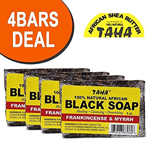TAHA 100% Natural African Black Soap, Frankincense & Myrrh – 5 oz Pack of 4 – Organic Soap for Blemishes, Acne, Dry Scalp – Rich in Vitamins &...