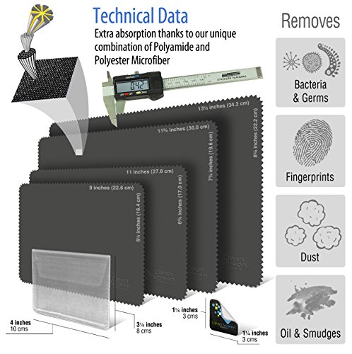 MULTI-SIZE KIT: 4 different Large Cloth sizes, so you have the right clothes for any type of job! Perfect for cleaning iPhones, Smartphones, Tablets, Cell Phones, Eyeglasses, Sunglasses, GoPro, Camera Lenses, Kindle, Laptops, SRL, LCD TVs, CDs, DVDs, Computer Flat Displays, Jewelry and even Car Interiors. Cloth Size: 13½ x 8⅝, 12 x 8¼, 11 x 6¾ & 9 x 6½ inches plus BONUS removable adhesive micro fiber tag/pad for cleaning iPhones, mobile phones & iPads.