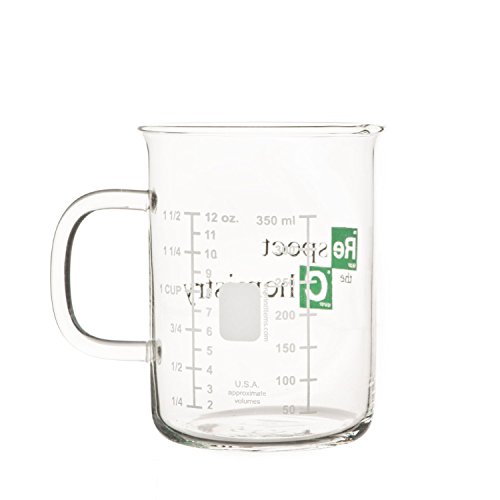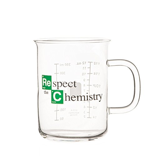 -. Brand : Cool TV Props -. EAN : 0649906410942 -. Feature : Made of borosilicate (laboratory) glass, Light-weight but durable / Silk-screening imprint, fired at 1200° F so paint won't chip or fade / Microwave and dishwasher safe as well as heat and oven proof / Easy to read markings measure up to 350 ml, mug holds 400 ml (12 OZ) / Makes a great unique gift ! -. Label : Cool TV Props -. Manufacturer : Cool TV Props -. MPN : BB1003 -. PackageQuantity : 1 -. PartNumber : BB1003 -. ProductGroup : Kitchen -. ProductTypeName : KITCHEN -. Publisher : Cool TV Props -. Size : 1 -. Studio : Cool TV Props -. Title : Respect the Chemistry Beaker Mug inspired by Breaking Bad (400 mL) -. UPC : 649906410942