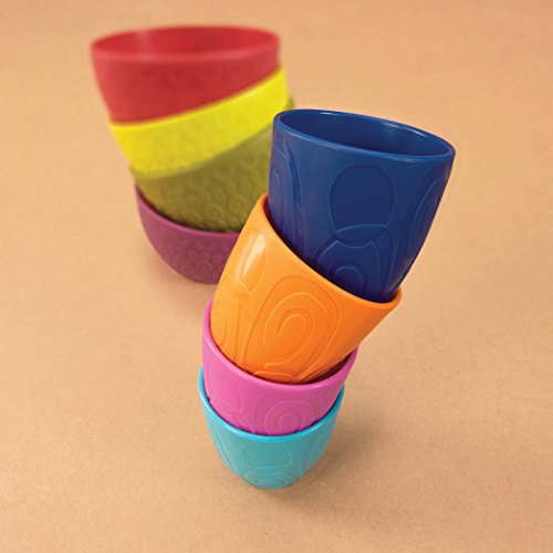 B. COLORS AND QUALITY - The cups, plates, and cutlery all feature the B. Toys' artful design, dependable quality, and zany color scheme that's appealing to both boys and girls.