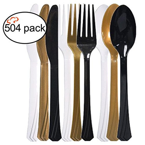 Tiger Chef 504-Pack Plastic Cutlery Set Heavy Duty Colored Plastic Silverware Set includes 168 Forks, 168 Teaspoons, and 168 Knives in Black, White and Gold…