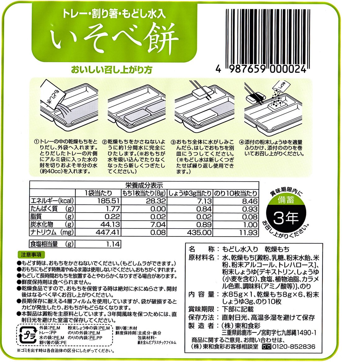 In the aluminum bag, there are exclusive plastic trays and disposable chopsticks, preservative water for reconstitution, 6 pieces of drying moisture and powder soy sauce, paste, in each bag.