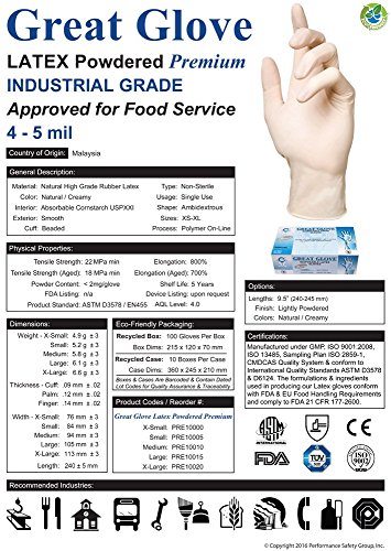 GREAT GLOVE PRE10010-M-BX Latex Premium Industrial Grade Gloves, 4 - 5 mil, Powdered, Smooth, Extra Thickness, General Purpose, Food Safe (FDA 21 CFR 170-199), Medium (Pack of 100)
