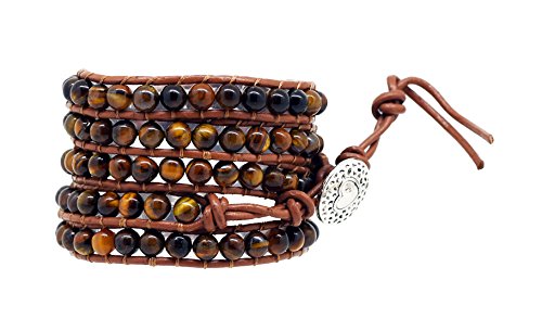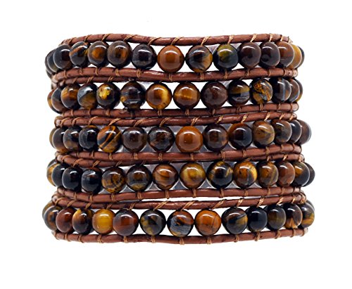 -. Feature : Made from simulated tiger eye stone beads, alloy, and leather cord; Free Mandala Crafts gift bag; The beautiful pattern and color of every bead vary due to the nature of stones; / Width (wrapped 5 Times) About 1.75 inches; Width (wrapped 6 times); About 2 inches; it is a wide bracelet and please make sure this is not bulky to you; / Please note the bracelet cord is made from cowhide leather. Cowhide leather has a slight odor of natural leather. The odor might exist especially after being packed in a sealed plastic bag before it reaches you. Though most people like the leather smell, it might be unpleasant to some people. Leaving it in a sealed container with baking soda will be very helpful to get rid of the odor if you think it is unpleasant. / Total Length: about 40 Inches; Length of the bracelet with stones: About 35 inches; Length of the Buckle Cord Without Stones; About 5 inches; Bead size: About 6mm; Please make sure the length will fit you by measuring your wrist's circumference. / Please note this bracelet mostly can wrap around your wrist about 5 times. For people with smaller wrists, it can wrap up to 6 times. Once you decide on the length of the bracelet you need, you can cut the extra cord at the end to shorten the bracelet; You can also untie the knots on the leather cord at the end of the bracelet and retie the knot to fit your wrist;