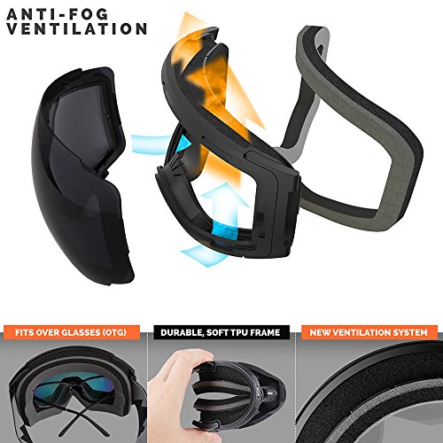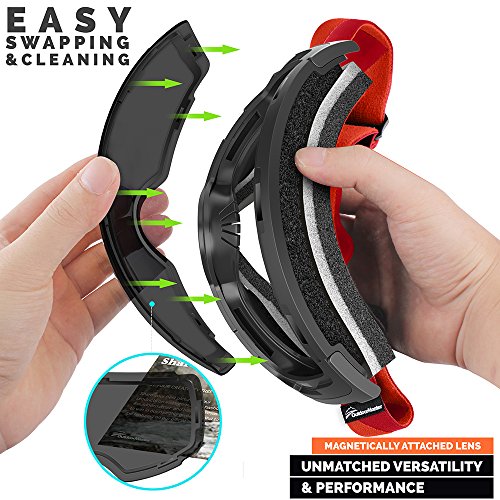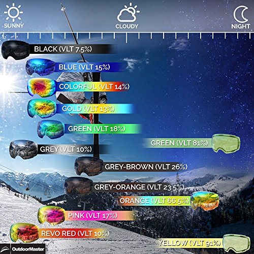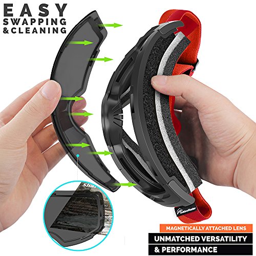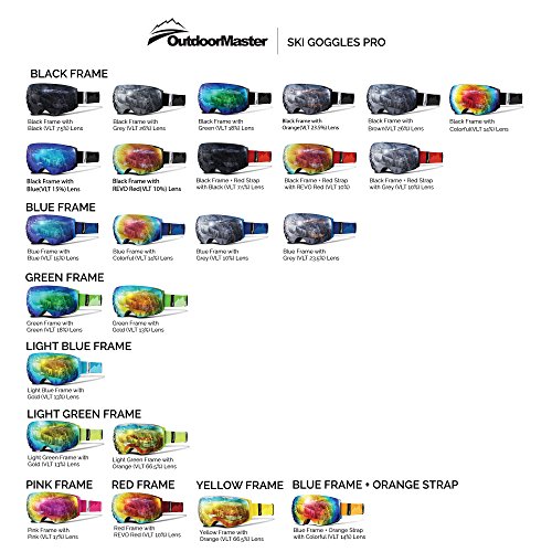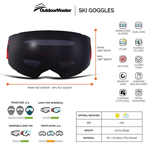 -. Feature : PERFORMANCE SKI GOGGLES WITH FRAMELESS DESIGN: Snow Goggles for Men, Women & Youth. The big, spherical, frameless lens provides a truly unobstructed & clear view of the slopes. Designed for ultimate performance & comfort. / INTERCHANGEABLE LENS SYSTEM: The Interchangeable lens system lets you swap lenses according to the weather and personal preference. All our lenses are treated anti-fog and anti-scratch coating and offers 100% UV protection. / WEAR OVER GLASSES (OTG): These Goggles features a OTG (over the glasses) design that lets you wear your prescription glasses under the goggles. Because good vision is important! / HELMET COMPATIBLE: The extra long elastic strap are attached to outriggers that pivot ensure great helmet integration. Works with all ski & snowboard helmets. / WHAT YOU GET: 1 x OutdoorMaster Goggles PRO, 1 x Protective Case, 1 x Carrying Pouch, and our customer-favorite 6 months warranty and friendly customer service!