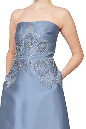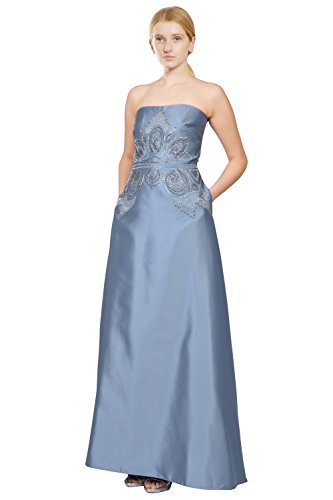 Blue strapless a-line evening gown. Silky twill and regal front beading lend this gown an iconic, icy glamour. Back zipper closure. Boned lining. Side seam pockets.