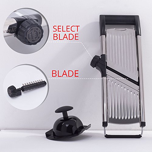 - QUICK AND EASY SLICING. Our Mandoline Food Slicer comes with adjustable thickness, so you can get perfectly flat slices from 1 to 9 mm and 4.5-9 mm julienne. Just turn and set the knob to cut sweet potatoes, cabbage, cucumbers, onions, tomatoes, avocados, bananas, and more. Easily cook french fries, potato chips, fruit and vegetable salads, and much more! This tool is a perfect Christmas gift idea!