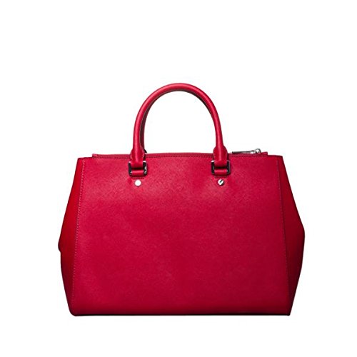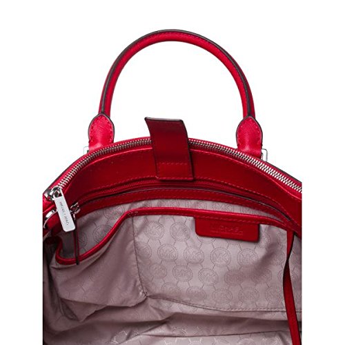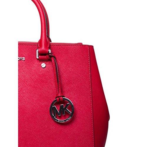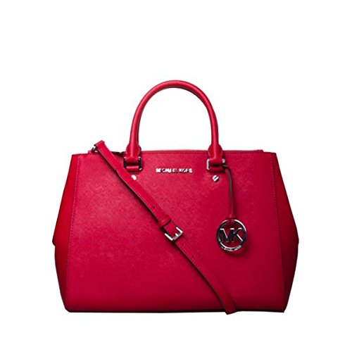 -. Binding : Apparel -. Brand : -. Color : Chili -. Department : womens -. EAN : 0889154327818 -. Feature : 100% Cow Leather; Silver tone hardware / Top Handle: 4.5"; Adjustable Strap: 18-20" / Interior features back zip pocket, cell phone pocket, 3 multi-functional slip pockets and a key fob clip / Measures 13 X 9 X 5" / Top Zip Closure with 100% Polyester Lining -. Model : 30S4STVS7L -. ProductGroup : Shoes -. ProductTypeName : HANDBAG -. Title : Sutton Satchel Saffiano Leather Shiny Rhodium, Color Chili -. UPC : 889154327818