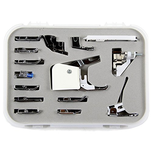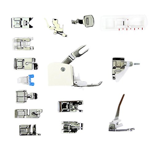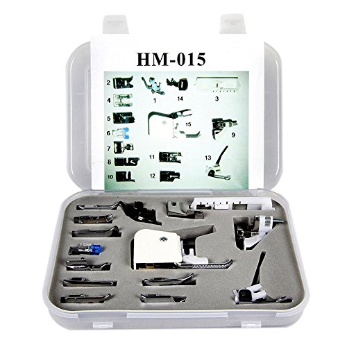 15 different presser feet for low shank sewing machines. Create fashionable accent on your blouses, dresses, sheer curtains, skirts and shirts easily.