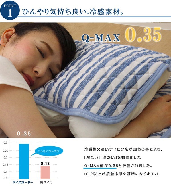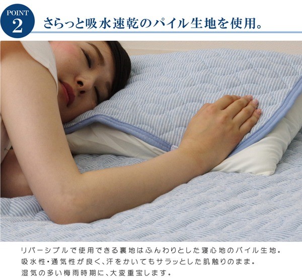 接触冷感・吸水速乾・消臭機能が特徴の商品です。こちらの商品は、両面使えるリバーシブル素材です。表地にはQ-MAX0.35以上の冷感素材を使用。裏面には柔らかな肌触りが特徴の吸水速乾パイルを使用しています。中わたには消臭加工を施しています。エアコンが苦手な方でも快適に。節電、節約にもつながる商品です。ズレにくいよう端にはゴムバンド付きです。洗濯機で丸洗いが可能なので、いつでも清潔にご使用頂けます。