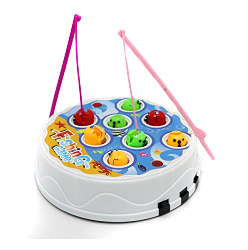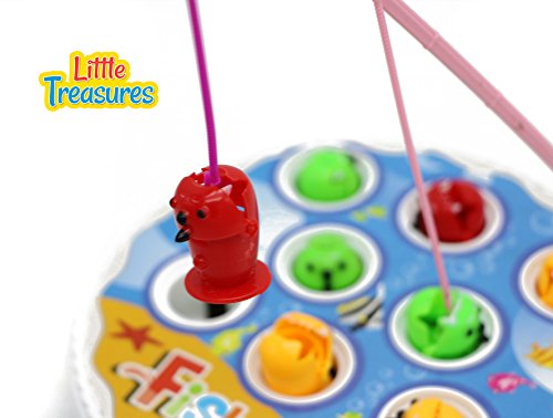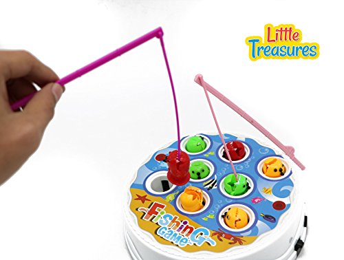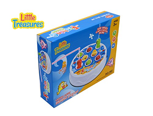 Studio : LITTLE TREASURES Publisher : LITTLE TREASURES Binding : Toy Product Description Fun Fishing Game toy set has two fishing rods to reel in 9 multicolor fishes with musical light fishing fun. Kids love to compete with each and this toy set gives them the opportunity to outdo each other or parents as they try to catch the highest number of fishes as they swim around opening and closing their mouths. It cultivates hand-eye coordination and cause-and-effect relationship to kids with competitive contest between each other while making them realize the significance of patience to instill self-perseverance to obtain treasured objectives, a perfect learning for life. Blue hues of the game set with colorful fishing rods and fishes means kids will never have a dull moment during playtime. The game involves kids and they learn the usage of several elements, obtain the gist of utilization and learning muscle-eye timely coordination to obtain objectives. They shall use acquired agility and skills to help them all their life. Festively colored parts and unique features add immense fun and creative play to the game. Real, appealing colors and tones attract the little ones extensively, allowing them to indulge in the toy game of fun, pretend play. 0