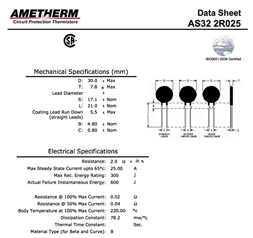 Aqua-Rite Thermistor AS32 2R025.( Pack of 2) Inrush Current Limiter 2 Ohm Ohm ±25% 1.18" (30mm)