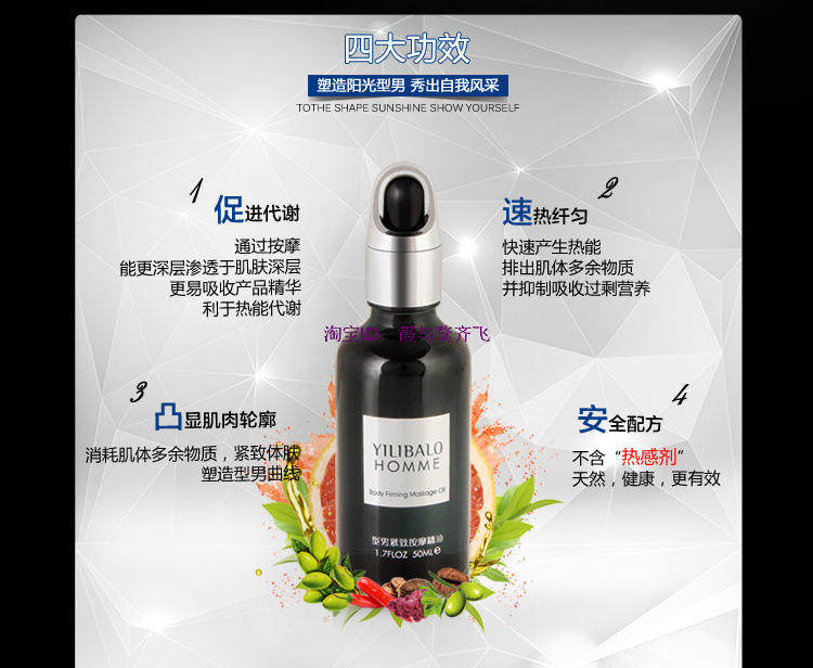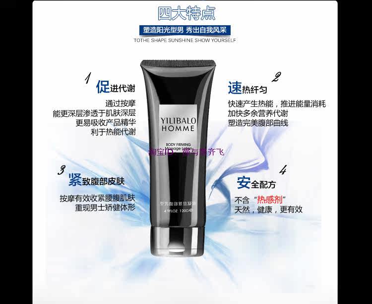 Efficacy: Yi Li Bei-type men's abdomen fast condensate, by Taiwan Yi Li for men's waist and abdomen research hot fast compact formula to Alishan tea, pepper oil, ivy and other plant extracts from the combination of smear waist After the massage, can quickly import the skin deep, and gradually produce heat to consume skin tissue excess material, effectively tighten the waist and abdomen skin, shaping handsome chic sunny male.