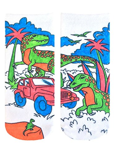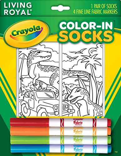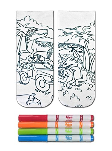Kid's Crayola Color-In Socks lets your imagination run wild. Bring these dinosaurs to life with 4 different fabric marker colors. The magic starts here with your expression of choice. If you love dinosaur's these sock's are perfect for showing off your interests. The design on the socks is like a scene straight from Jurassic Park.You have the ability to make these sock's into whatever you want them to be. You can color the socks in subtly or go all out in wild colors. With this purchase you will receive 1 pair of dinosaur design socks and 4 fabric markers. Socks fit children's shoe size 9 through women's shoe size 11 and are made from 100% polyester. READ WASHING AND CARE INFORMATION located on back of packaging. For ages 3+ Collect them ALL!Feature