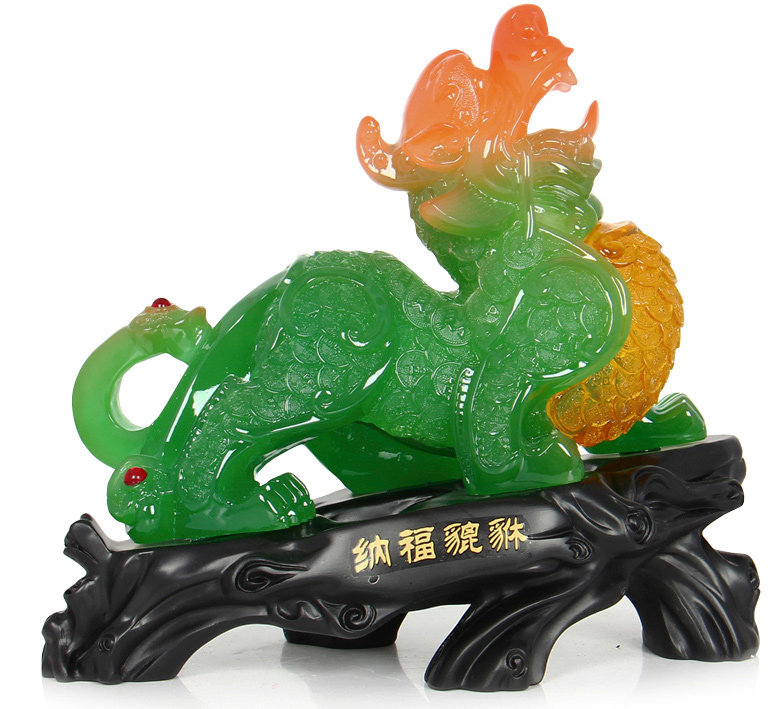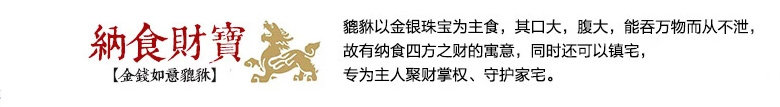 貔貅纳食四方之财。传说助黄帝作战有功,被赐封“天禄兽”又称“辟邪”。
