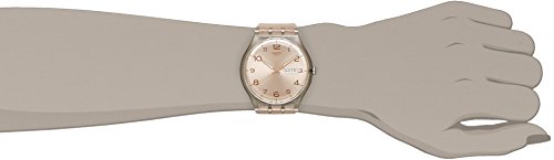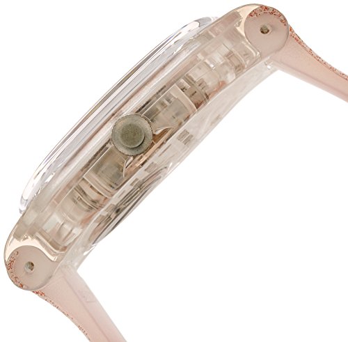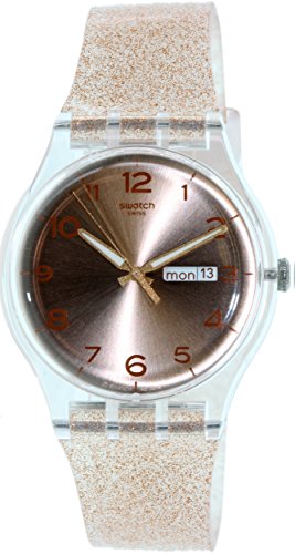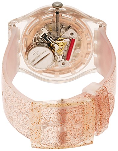 Transparent plastic case with a pink silicone strap. Fixed transparent plastic bezel. Pink gold dial with luminous pink gold-tone hands and Arabic numeral hour markers. Dial Type: Analog. Luminescent hands. Day of the week and date display at the 3 o'clock position. Quartz movement. Plastic crystal. Pull / push crown. Solid case back. Case diameter: 41 mm. Case thickness: 10 mm. Round case shape. Band width: 20 mm. Tang clasp. Water resistant at 30 meters / 100 feet. Functions: date, day, hour, minute, second. Casual watch style. Swatch Glistar Pink Gold Dial Pink Silicone Ladies Watch SUOK703.Feature