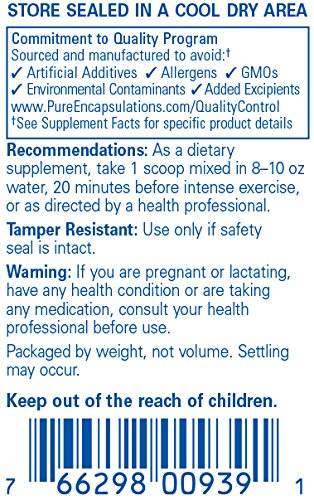 DOSAGE: Pure Encapsulations recommends 1 scoop mixed in 8-10 oz water, 20 minutes before intense exercise, or as directed by a health professional. Servings Per Container: 20.