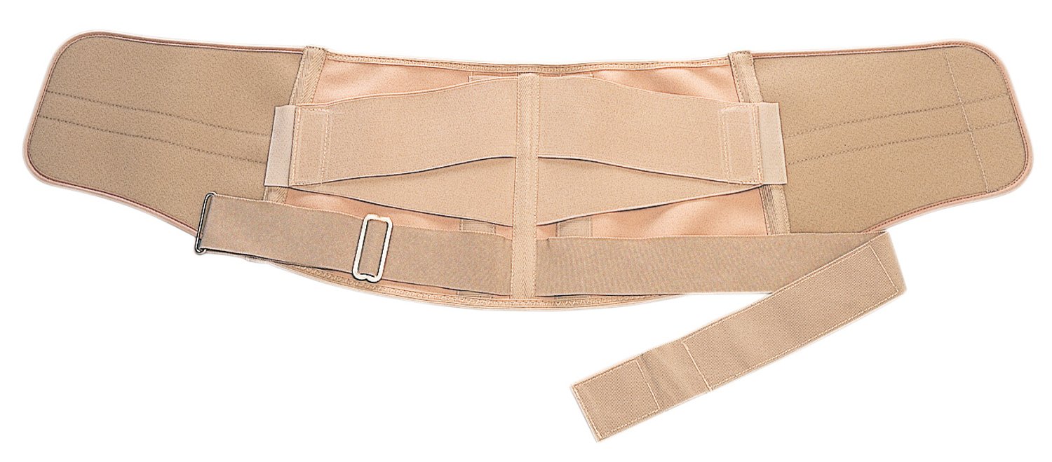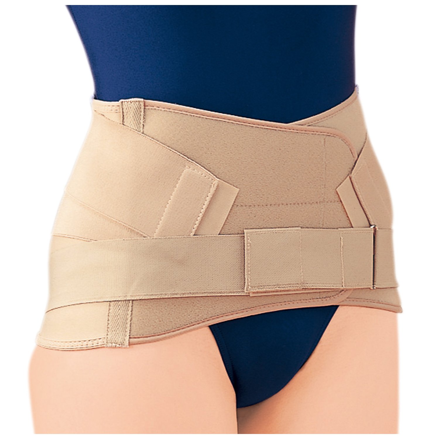 An auxiliary belt and two aluminum stays to promote abdominal pressure rise support the lumbar region.