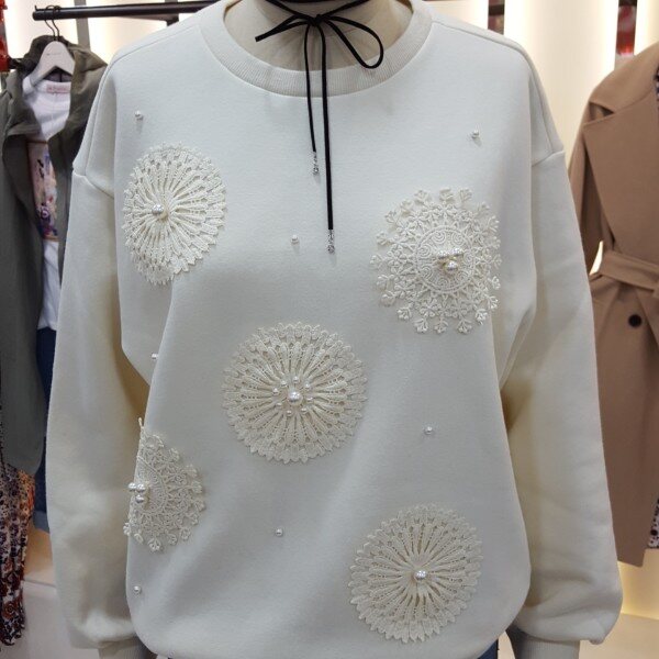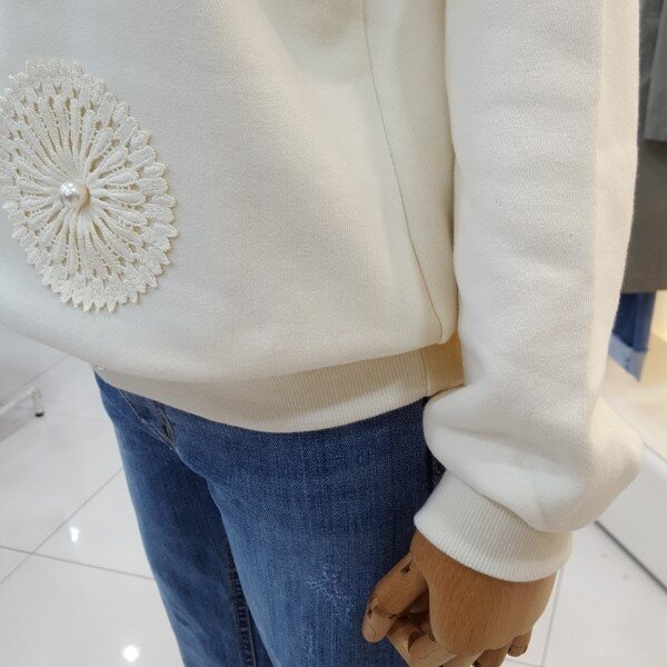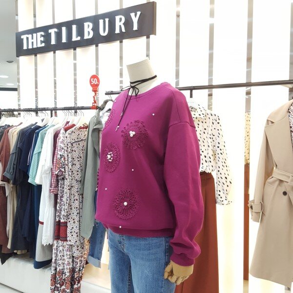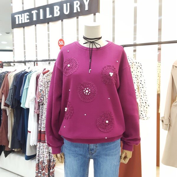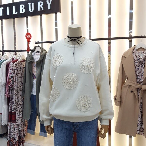 페미닌한 분위기로 즐기기 좋은 자수디테일의 맨투맨티셔츠입니다.펄장식이 고급스럽고 폴리혼방 코튼소재로 편안하고 쾌적하게 착용할수있는 아이템입니다.안감기모처리되어 포근하고 보온성뛰어난 제품입니다.