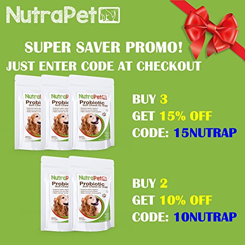 -. Feature : ❥ WEEKEND SPECIAL!* UP TO FOUR MONTHS - The leading brands don't have anything on us! The Probiotic Soft Chews from NutraPet has TEN times the CFU and lasts two to four times as much. It includes two vital probiotic strains formulated by Veterinarians specifically for your dog. / ❥ SUPERIOR TASTE - Don't get fooled by those "tasteless" pro biotics that your pup will end up leaving. The NutraPet Probiotics Soft Chews for Dogs has Real Chicken Liver that will make your dog go crazy over the flavor! You will see when you give your dog the first chew, he/she will eagerly ask for more like if it was their favorite treat. / ❥ ALLERGY-FREE SKIN SUPPORT - Red, blotchy and itchy skin can be a sign of yeast overgrowth, especially if accompanied by a bad smell. Our grain & gluten-free probiotics will help your dog to eliminate wastes and toxins in the body, resulting in an overall healthy skin and soft coat. / ❥ WE GO ABOVE AND BEYOND - Bring life back your pup from inside out with better digestion, anti-diarrhea and no more loose stools. Say goodbye to stinky gases and overall, Support their Immune System! We want to make sure your dog stays healthy and vital so you spend more quality time with your pup. / ❥ 100% RISK FREE MONEY BACK GUARANTEE! **SUPER SAVER PROMO - BUY 3 GET 15% OFF and qualify for FREE Shipping. Use Code 15NUTRAP at Checkout. Check Special Offers Below for more info** - We understand that looking for ways to ease the pain of your pup can be stressful. So if your dog does not love the flavor or don't see any improvements after the first two weeks of use, ask us for your refund within the first 30 days of purchase. Stress-Free, no questions asked!