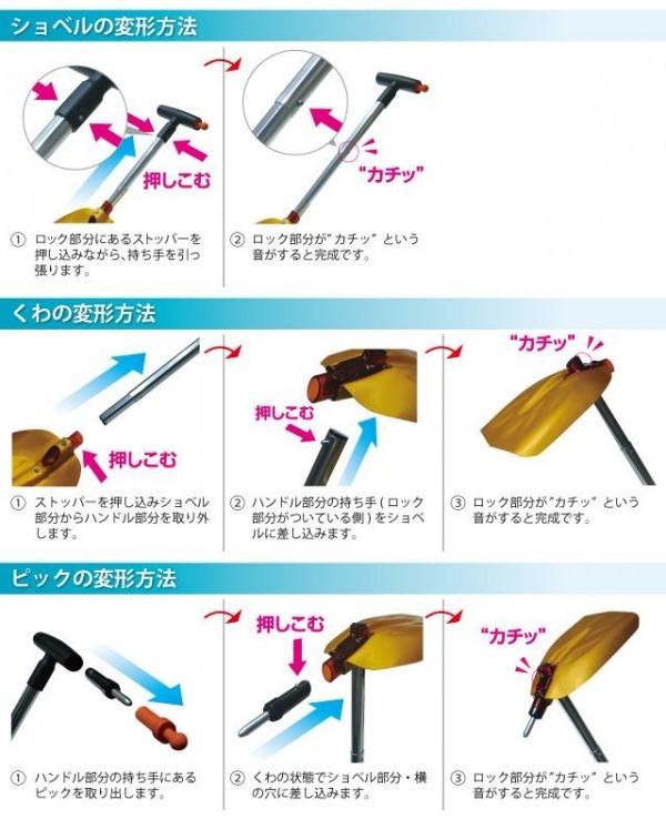 | 除雪作業やアウトドアに最適、コンパクトに収納可能な軽量組み立て式ショベルです。!!くわ・ピック・ショベルの3通りの使い方が出来ます。ピックを付ければ氷を割ることも可能 です。 |