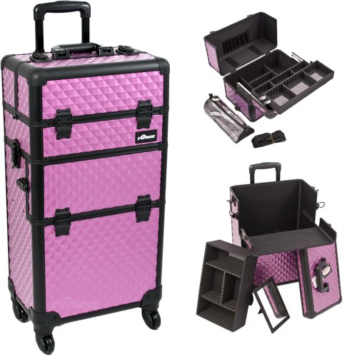 - Beautiful new purple diamond pattern with black aluminum trimming Heat resistant exterior material keeps the case cool and protects your cosmetics Heavy duty handle for added comfort and grip