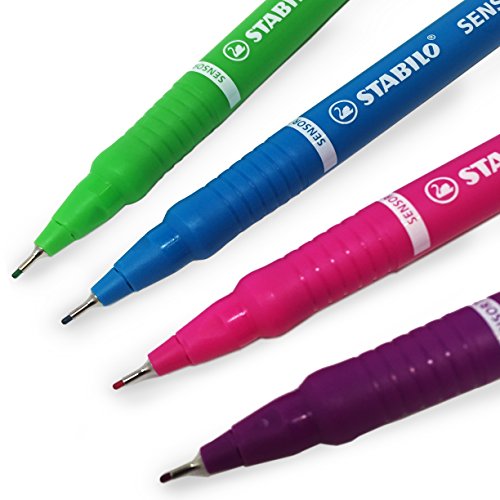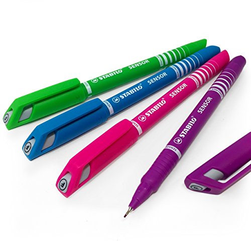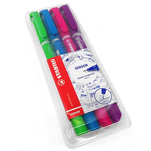 -. Feature : 4 Sensor Fineliner Pens - Light Green, Light Blue, Pink, Purple - Stabilo / Each pen writes a fine 0.3mm line and features cushioned tips to create prefect lines. / The metal encased fineliner nib contains a sP.R.Ing so the tip does not bend, break or disappear when writing. / These pens are design for a relaxed feeling whilst writing, and provide writing comfort, even under pressure. / The sensor pens can be used with a ruler and are perfect for school, college, office or at home.