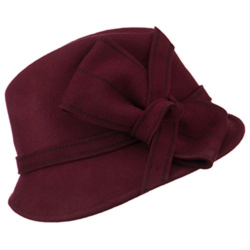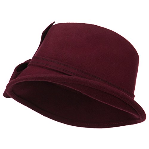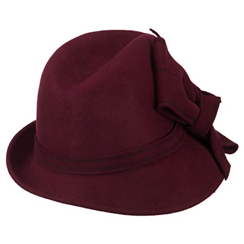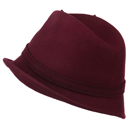 -. Binding : Apparel -. Brand : SS/Hat -. Department : womens -. Feature : Made of 100% wool felt. / One size fits most ladies with an adjustable elastic tie string inside, fitting up to 7. / Adult/Female. / Fitted with an inner satin hat band. / Crown measures 4 inches deep. -. ProductGroup : Apparel -. ProductTypeName : HAT -. Title : Wool Felt Ribbon Bow Fedora - Burgundy