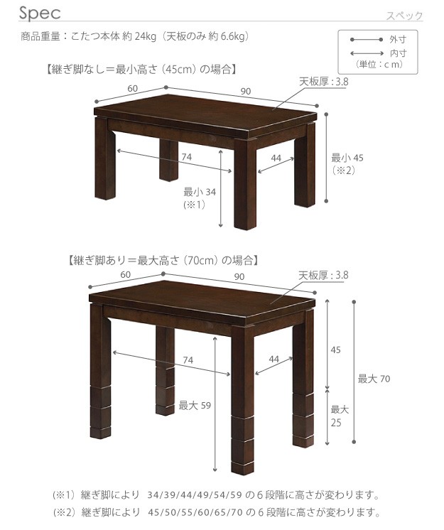 サイズ(cm):こたつ-幅90x奥行60x高さ70(45/50/55/60/65)・約24kg、椅子-幅48x奥行50x高さ74.5(69.5)・約11kg、布団-250x220cm
