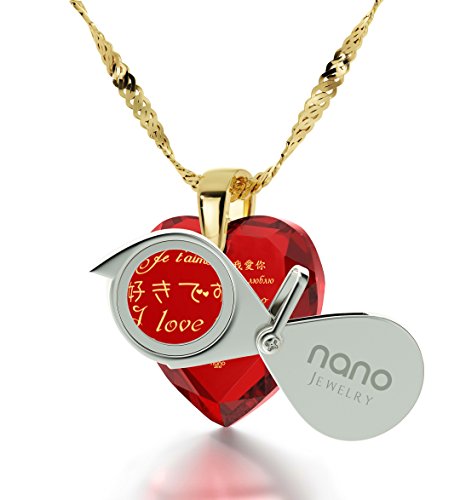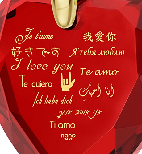 -. Feature : CZ I Love You heart-shaped pendant and crystal drop earrings gold plated jewelry set. Heart shaped dangle earrings,0.4 inches, 10mm, are set in a pinch bail and measure 1.25 inches, 3.3cm, including the fish hooks. Please note; the heart earrings do not contain an inscription / Love necklace is inscribed with I Love You in 12 different languages in 24k gold onto a cubic zirconia gemstone, 0.8 inches and suspends from a high quality, gold filled traditional Italian Singapore chain measuring 18 inches. / Nano jewelry is uniquely inscribed in 24k gold using innovative 'never seen before' technology, allowing us to place a labyrinth of miniature text over the surface of small stones, sometimes only visible with the help of a magnifying glass, included with your order. / The perfect unique surprise present for any special woman you wish to say I love u to, on any occasion. The romantic pendant arrives in a jewelry gift box, ready for gift giving or receiving. / Our fine love jewelry makes the perfect anniversary gift idea for her, so treat your wife on your first year, fifth, tenth or 50th wedding anniversary. Delight mom on Mother's Day, your girlfriend for Valentines Day, your daughter for Christmas or best friend on her birthday.