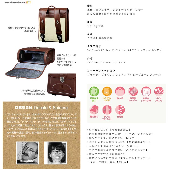 이탈리아 출생의「T T《에》T T」서는,인간공학에 기초해 만들어졌 경쾌한 짊어져 기분과,사용하기 쉬움이 매력의 란도세루(초등학생이 어깨에 매는 가방).