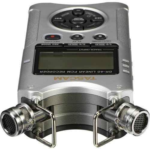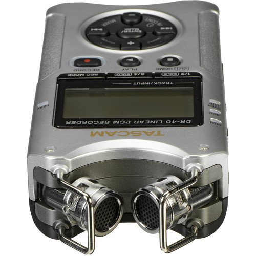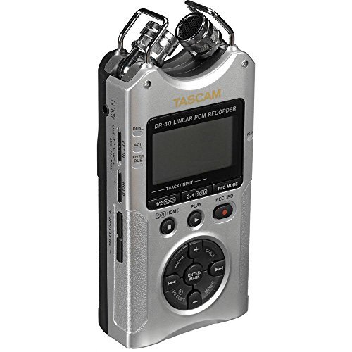 The silver DR-40 4-Track Handheld Digital Audio Recorder from Tascam provides professional-level features and flexibility in a compact durable design that's ideal. The unit can record high-quality WAV/BWF or MP3 files to readily-available SD or SDHC flash memory cards, allowing you to record hours of material and share it easily. A 2GB card is included so you can get started recording right away. The recorder features built-in adjustable condenser microphones, allowing you to choose an X/Y or A/B recording pattern to meet the needs of your environment and application. A built-in limiter and switchable low cut filter reduce peaks and rumble for cleaner recordings. There are a pair of Neutrik combo inputs that accept XLR and 1/4" connections for terrific flexibility. Built-in mic preamps provide phantom power so you can use external condenser mics. A 3.5mm headphone/line output allows you to connect additional equipment such as headphones or small speakers. The high-speed USB 2.0 port allows you to transfer your recordings to a Mac or PC for editing or sharing. A built-in speaker allows you to play back your recordings immediately for review. Other features include a dual recording mode, and overdub mode, and a peak reduction feature. There is a 2-second pre-recording buffer to ensure that you never miss a priceless moment due to pressing the record button too late. There is also a chromatic tuner and a stereo reverb effect. A threaded mounting hole lets you mount the recorder on a tripod for terrific stability. The DR-40 can operate for up to 15 hours from 3 standard AA batteries. It can also use USB bus power via the included cable. An optional AC adapter and external battery pack (sold separately) provide additional powering options. Compact Design The small size of the recorder makes it easy to use in the field for a variety of applications High-Quality Recording Record WAV/BWF files at rates up to 24-bit/96 kHz and MP3 files up to 320 kFeature