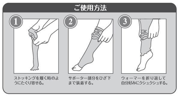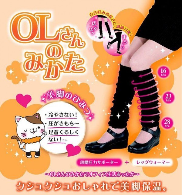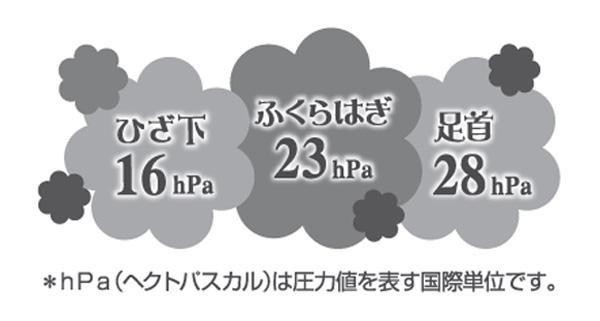 OLさんが社内や外で着けてもおかしくない様にファッション性をプラスしました。事務仕事や立ち仕事により、足がむくむ方に足首(28hPa)→ふくらはぎ(23hPa)→ひざ下(16hPa)と段階的に着圧を強くして、心地よく引き締めます。ひざ上・ふとももまでカバーできるようにロングタイプのレッグウォーマーとしても使えます。 |