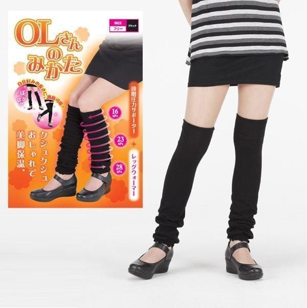 | OLさんが社内や外で着けてもおかしくない様にファッション性をプラスしました。事務仕事や立ち仕事により、足がむくむ方に足首(28hPa)→ふくらはぎ(23hPa)→ひざ下(16hPa)と段階的に着圧を強くして、心地よく引き締めます。ひざ上・ふとももまでカバーできるようにロングタイプのレッグウォーマーとしても使えます。 |
