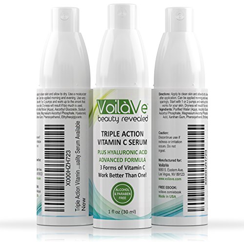 -. Binding : Health and Beauty -. Brand : VoilaVe -. EAN : 0820103341493 -. Feature : WHY THREE FORMS OF VITAMIN C: There are many different forms of Vitamin C. Some are absorbed more readily by the skin, some are more stable and retain their potency longer, and some have proven to rebuild collagen and fight free radicals more effectively than others. Our formula contains the three forms that combine all of these benefits. It is the most advanced and powerful Vitamin C serum on the market. / POWERFUL ANTI-AGING RESULTS: Proven to stimulate collagen and reduce fine lines and wrinkles. Brightens and softens skin for a more radiant and youthful complexion. Powerful antioxidants neutralize free radicals to prevent and reverse sun damage and fade sun spots and discoloration. / MULTIPLE BENEFITS: Not only is our Vitamin C serum a powerful anti-aging product, it reduces fine lines and wrinkles, evens skin tone, softens skin texture, brightens dark spots, hyperpigmentation, & discoloration, shrinks pores, and helps clear stubborn acne. / ADVANCED AIRLESS PUMP TECHNOLOGY: Unlike dropper bottles that expose other serums to air and light with each use, our premium airless pump protects and preserves our Triple Action Vitamin C Serum from the photochemical decomposition and oxidation that causes a loss of potency in other Vitamin C serums. VoilaVe Triple Action Vitamin C Serum is never exposed to air or light, which allows it to retain 100% of its collagen restoring, anti-aging potency from the first drop to the very last. / PURITY, SAFETY, AND EFFECTIVENESS: Our Triple Action Vitamin C serum is made in the USA in our advanced FDA-certified facility. The patented formula contains only the finest ingredients, without fillers, dilutions, parabens, or alcohol and is never tested on animals. We also back our products unconditionally with a 365-day money back guarantee. If you are not completely satisfied, simply contact us and we will refund your purchase, no questions asked. Complete customer satisfaction is our #1 priority. -. Label : VoilaVe -. Manufacturer : VoilaVe -. MPN : Voila-tripc1 -. PackageQuantity : 1 -. PartNumber : Voila-tripc1 -. ProductGroup : Beauty -. ProductTypeName : BEAUTY -. Publisher : VoilaVe -. Studio : VoilaVe -. Title : Triple Action Vitamin C Serum + Hyaluronic Acid for Face - Contains Three Forms of Vitamin C for Superior Results - Pure & No Fillers - Neutralizes Free Radicals - Finest Serum Available - 1 oz -. UPC : 820103341493