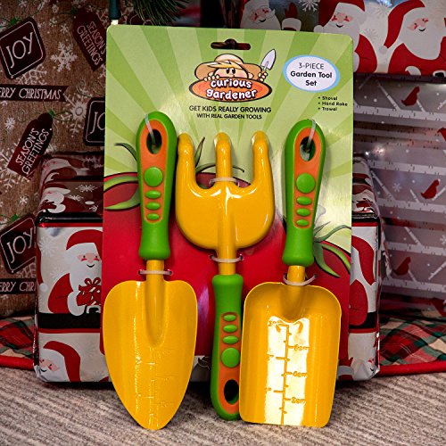 Studio : Curious Gardener Publisher : Curious Gardener Binding : Lawn Patio Product Description Get your kids really growing with the curious gardener 3Piece garden tool set! the set includes a kid-sized trowel, shovel hand rake, the essential tools for any budding gardener. Designed with metal heads soft touch grips, the tools are strong enough to get the job done but small comfy enough for your child to easily use. With these tools, you can teach your child to garden right along side of you! teach them to break up hard soil to use for potting plants with the hand rake. Then, help them scoop dirt into seeding pots with the garden shovel. Finally, show your kids how to measure the seed depth with the trowel using the engrained measurements featured on the metal head! using the curious gardener 3Piece garden tool set, your child will be growing their very own plants in no time! 0
