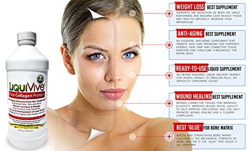 -. Binding : Health and Beauty -. Brand : Life Miracle USA -. Color : Clear -. EAN : 0697547848273 -. Feature : COLLAGEN IS A MIRACLE WORKING ANTI-AGING POWERHOUSE - We lose 1-2% of our collagen every year after age 30, which is when physical aging becomes noticeable. LiquiVive collagen is an essential anti-aging supplement that targets skin care problems and supports overall skin, hair and connective tissue function and structure throughout the entire body. Also supports the reduction of body fat, while maintaining and building lean muscle tissue. May help to naturally increase your metabolism. / AMAZING ANTI-AGING BENEFITS. Builds and strengthens bone matrix. Collagen is the mechanical strength of bone, joints and the entire structure of your body. Repairs and builds connective tissue for improved elasticity, improves blood vessel quality to help improve circulation, and can help promote wound healing and a clearer complexion--all physiological attributes that break down naturally as we age. / LIQUID COLLAGEN PROTEIN IS FAR MORE ABSORBABLE THAN PILLS - The problem with collagen pills and tablets is they have to go through the entire digestive process to be broken down, and you body only uses what is left over. Our liquid collagen peptides have the highest bioavailability and net protein utilization, because it is in liquid form. It is predigested and hydrolyzed with natural enzymes before bottling. Ready-to-use and no mixing required. Liquid delivery is perfect for people unable to swallow pills, or difficulty consuming solids. / SUPER CONCENTRATED FORMULATION - 240,000mg of collagen amino acid peptides per bottle. Add the concentration to the dramatically higher absorption rate over pills, and you have a super collagen delivery system. This bio-active collagen contains over 90% pure protein concentration. / BUILD AND REPAIR SKIN, HAIR AND NAILS FROM THE INSIDE OUT. Americans spend a fortune on anti-aging creams and serums with dubious results. Doesn't it make more sense to internally replace the cause of your outward aging by collagen supplementation? Collagen is the raw material of your hair, skin and nails (among many other things), and it is only in replacing this loss inside your body where you will see real results wiping away aging markers. -. Label : Life Miracle USA -. LegalDisclaimer : THESE STATEMENTS HAVE NOT BEEN EVALUATED BY THE FOOD AND DRUG ADMINISTRATION. THIS PRODUCT IS NOT INTENDED TO DIAGNOSE, TREAT, CURE, OR PREVENT ANY DISEASE. -. Manufacturer : Life Miracle USA -. MPN : 697547848273 -. PackageQuantity : 1 -. PartNumber : 697547848273 -. ProductGroup : Health and Beauty -. ProductTypeName : HEALTH_PERSONAL_CARE -. Publisher : Life Miracle USA -. Size : 16 fl. oz. -. Studio : Life Miracle USA -. Title : Collagen Liquid Protein Supplement - The #1 BEST Protein Replacement. Anti-Aging From the Inside-Out. Supports Strong Bone & Connective Tissue and Weight Loss. The Ultimate Hair, Skin & Nails Supplement. This Prescription Quality, Pure Super Collagen Hydrolysate Protein Is Better than Whey, Rice, Milk, Pea and Hemp Protein. More Absorbable Than Collagen Pills and Tablets. Type 1 and 3. 16 fl. oz. -. UPC : 697547848273