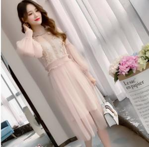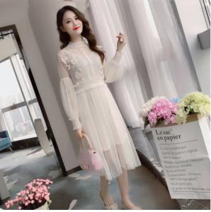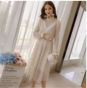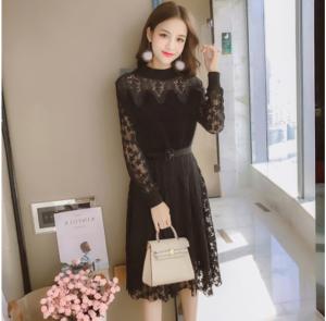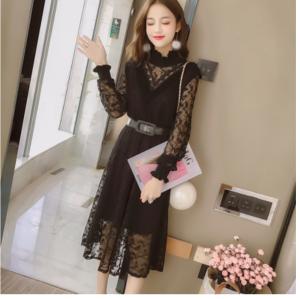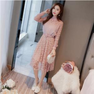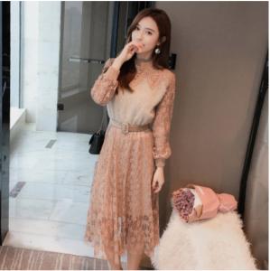 膝丈ワンピース レースワンピース 総レース 花柄レース ニット セーター ガーリー 華やか ベルト 上品 ひざ下