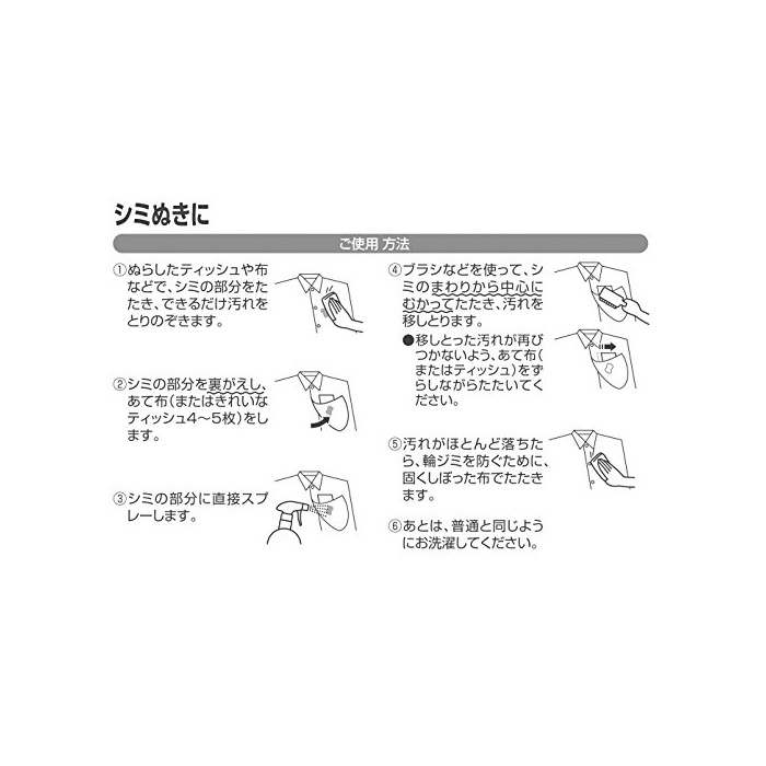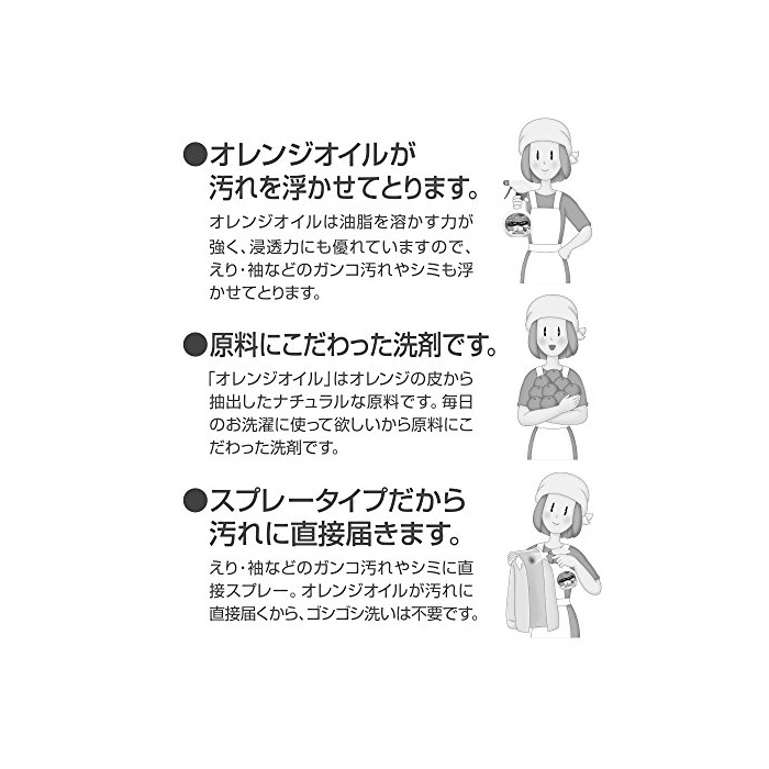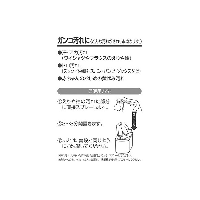 완고한 유얼룩을 강력 세정,옷깃수 등의 얼룩이나 기미(얼룩)로 직접 스프레이 하는 의류 부분 씻어 용의 세제입니다.