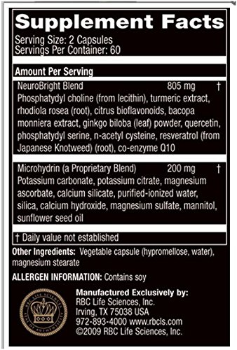 Studio : RBC Life Sciences Publisher : RBC Life Sciences Binding : Health and Beauty Product Description NeuroBright TM Think, Learn, Remember* Key Benefits: Supports and defends healthy brain function* Enhances the ability to think, learn and remember* Blended for cellular support and longevity* Supports improvement in memory and cognitive function* What is it? NeuroBright is a blend of herbs, in combination with the exceptionally powerful antioxidant, Microhydrin®. What is it formulated to do? NeuroBright's natural botanicals and super antioxidants have been shown to help support and defend healthy brain function and enhance your ability to think, learn and remember.* Who may benefit? Everyone can benefit by supporting their cognitive health. Experience the results for yourself and pass your knowledge onto others. How is it used? Take 2 capsules twice daily with water. 0