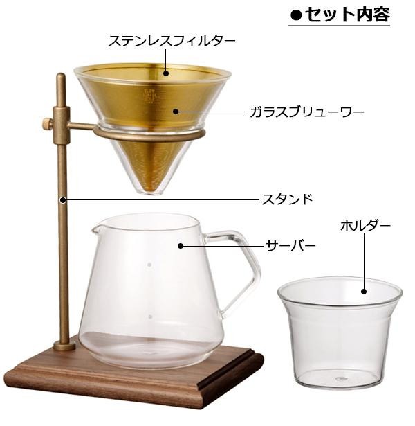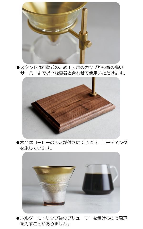 | 素材・材質 | 【スタンド】ウォールナット(ウレタン塗装)、真鍮、ステンレス、シリコーン 【フィルター】ステンレス(窒化チタンコーティング) 【ブリューワー、サーバー、ホルダー】耐熱ガラス |