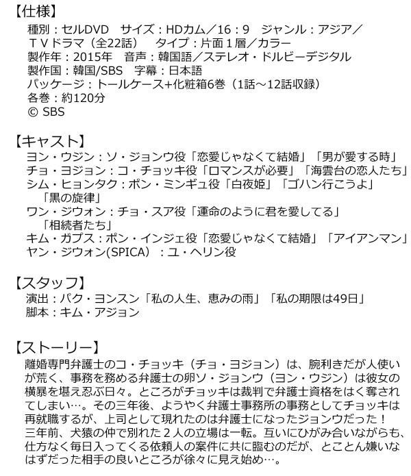 | 部下だったはずの男が今日から上司に?犬猿の仲だった男女が、上司と部下という立場でさまざまな離婚訴訟を担当し、問題を解決しながら少しづつ心を通わせていく!!話題作に次々主演、ヒットを続けている注目のスター、ヨン・ウジン主演作!! |